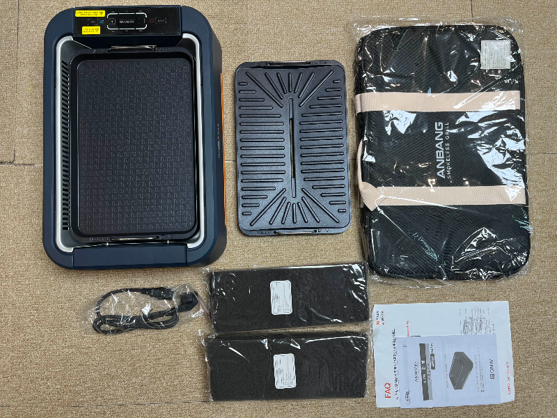 그릴 머신, 연결선, 일반 팬, 고기구이팬, 필터 여유분, 가방, 설명서 가 들어있습니다.