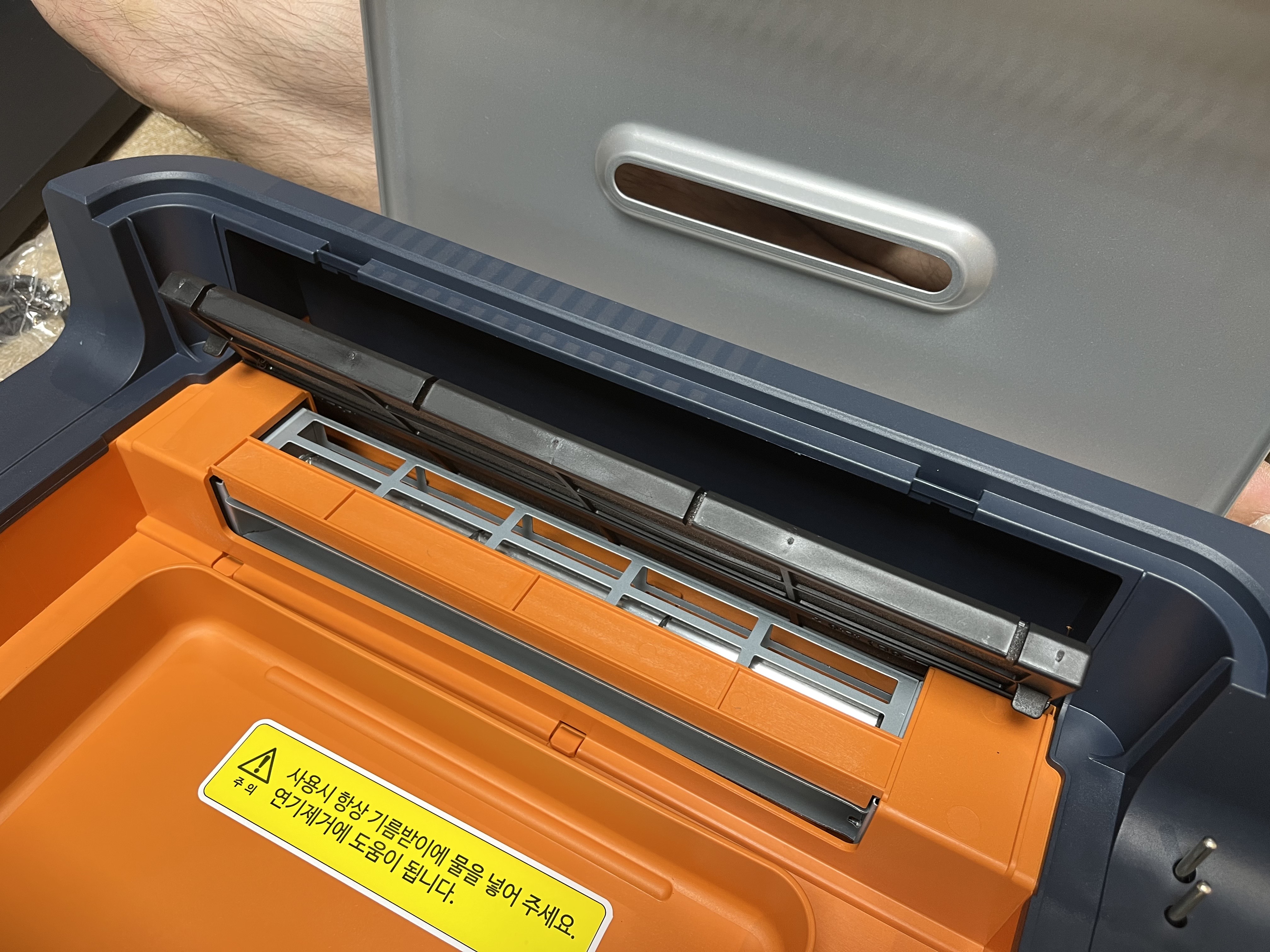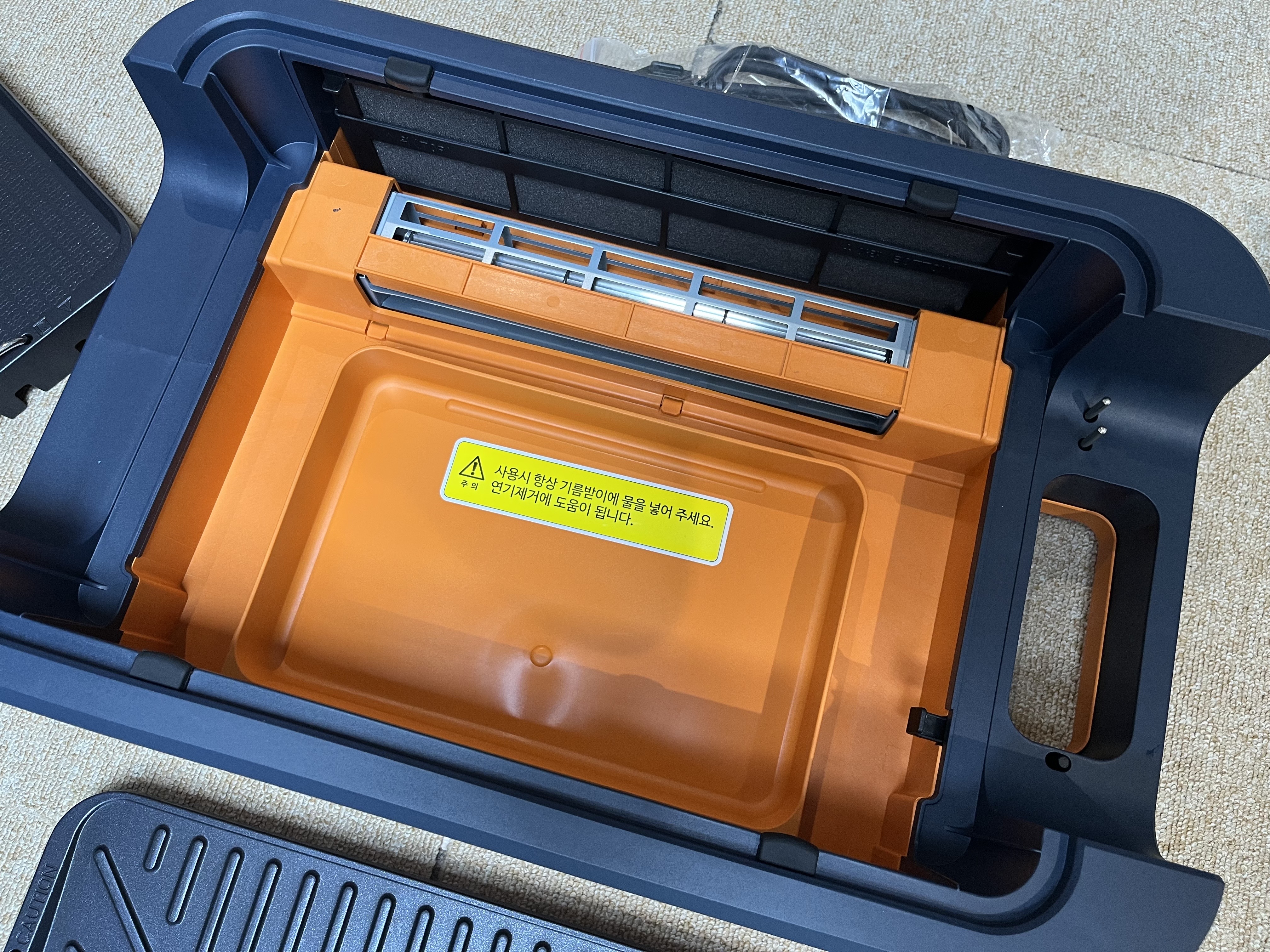 오렌지색 기름판을 손으로 잡아 뺀 뒤 종이컵 반 컵 정도의 물을 부어준 후 다시 결합시켜줍니다.