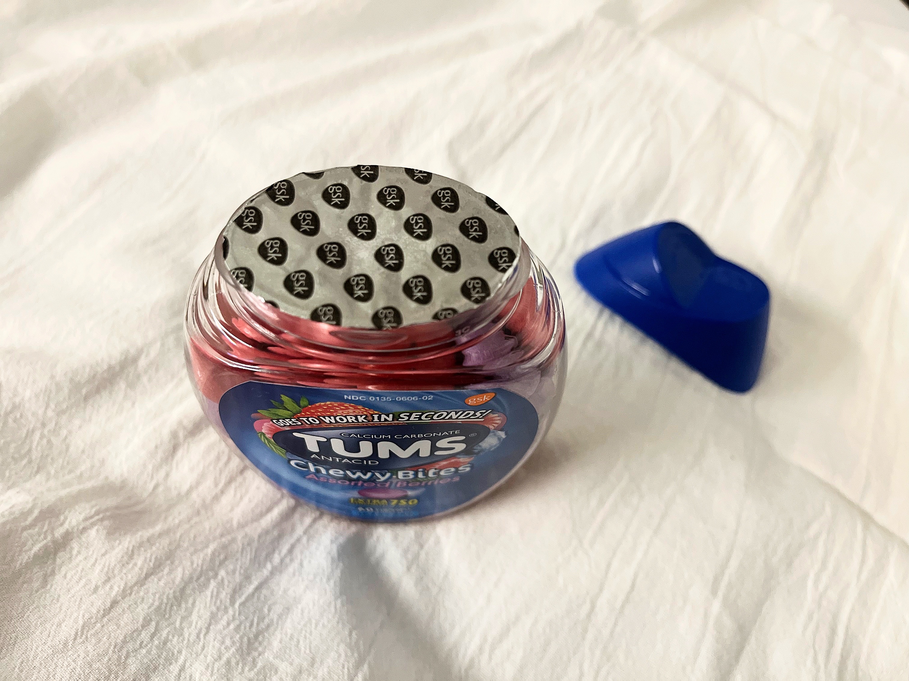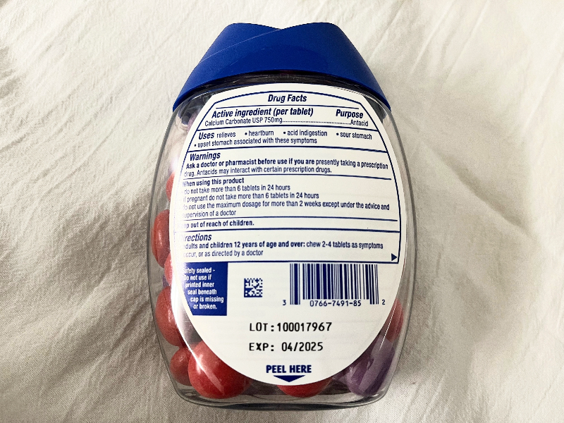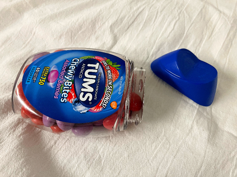 자극적인 음식을 많이 먹거나 저 처럼 역류성 식도염 증상이 있으면 과다 분비된 산이 위를 자극하면서 더부룩함 속 쓰림나 목에 이물감이 느껴지는데 텀스 제산제는 위산을 중화시키고 속쓰림, 소화불량, 배탈 등의 증상을 완화시켜줍니다.