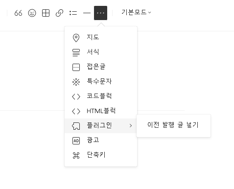 1. 삽입하고자 하는 위치에 커서를 놓고 글씨 도구 우측에 플러그인 -> 이전 발행 글 넣기 클릭